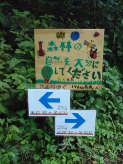 ところで鮫ヶ尾にはところどころ地元の小学生が作った 手書きの看板があって、自然保護を呼びかけたり 道案内がされていたりしていてなごみます。 が、その下の看板……(右) どっちだ 見たところ、左がきつくて短い 右がゆるやか(あくまで左に比べて)だが蛇行し なおかつ 草むら 道がちぎれとるがな!! |