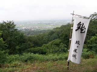 人が歩いた形跡を辿り、 急斜面といえば急斜面な坂を上って ようやく本丸へ。 さっきの看板からそう大して距離はないですが、 靴はちゃんと運動靴を履いてきて正解です。 粘土質っぽいぬめる地面なのと、 岩みたいな赤い地盤がむきだしになっていて 滑る人は滑ります。(滑った人=自分) 上りきった場所はちいさなあずまやが建っていて、 涼しい風が「鮫ヶ尾城」の旗を翻していました。 眼下にふもとの風景が広がります。 春日山は木で見えなかったけど、 恐らく数百年前、ここで空を焦がした煙は あちらから見えていただろうと思われます。 そこで一つの時代の終わりを感じた人もいただろう。 確かにここで消えた『歴史の可能性』がある、 という感慨に浸れる場所でした。 |
